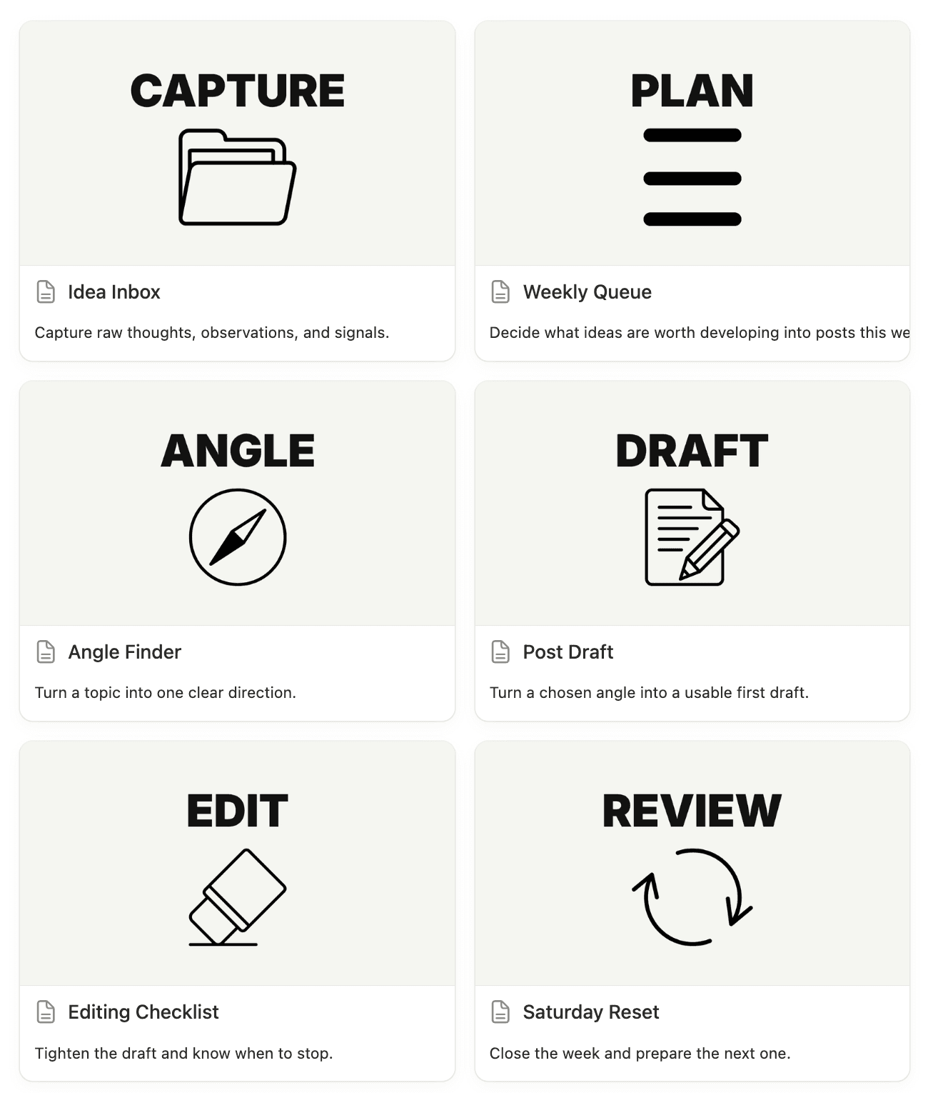 A repeatable Notion system for capturing ideas, shaping angles, drafting faster, and posting consistently.